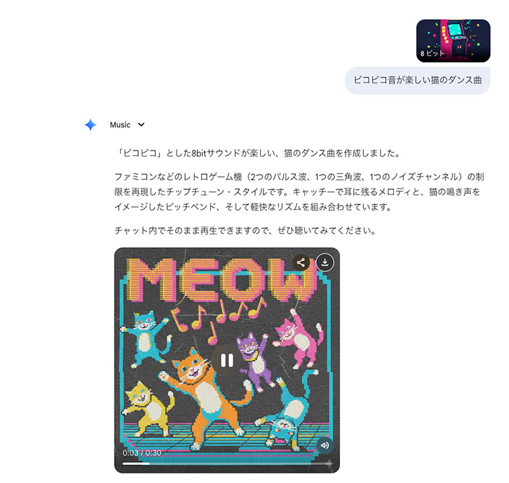 たったこれだけです。すると、数秒待っただけで……さくっと30秒の曲が生成されました!