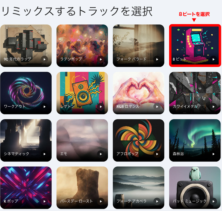 まずは曲の雰囲気を選んでみます。私は「8ビート」を選択してみました。